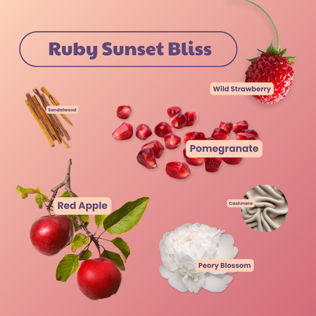 RUBY SUNSET BLISSThis Fragrance wraps your fabrics in an irresistible blend of pomegranate, wild strawberry, peony blossom, sandalwood, and cashmere.